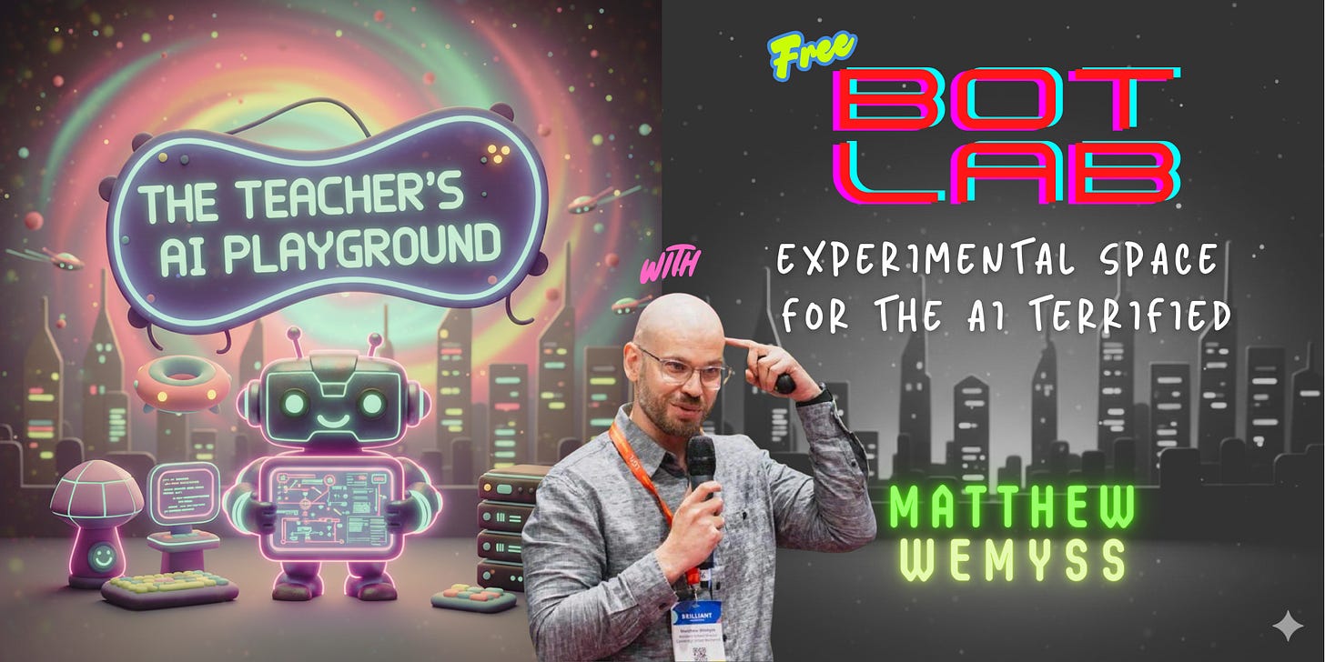 This is shortly followed by the free ‘Teachers’ AI Playground’ series. Our first session will be with Matthew Wemyss on 26th November, 4-5pm (GMT) and the session title is: ‘Bot Lab: Building Bots for Real-World Impact’. Tickets (free) and details below (click the picture):