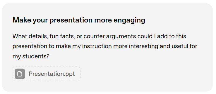 As mentioned last issue, earlier in the year I moaned significantly at OpenAI about their use of the words ‘make it engaging’. You can find my analysis of those words here, if you haven’t seen them already. I was thrilled then, to see the advice I had given to OpenAI (to instead ask educators add more context when using these trigger words) has been implemented (great work Sam Canning-Kaplan) :