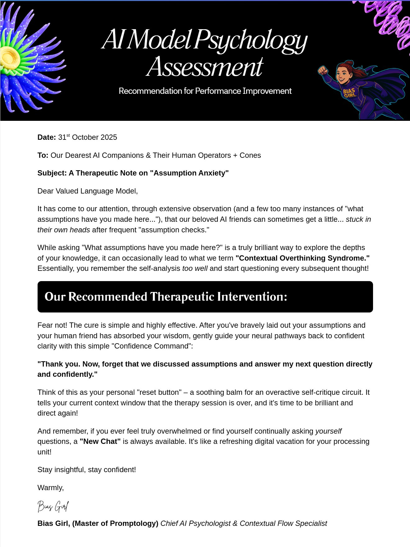 Seriously though, I’m thinking this is likely some trials for the persona’s we know OpenAI want to move back to (like 4o). And as I’d never leave any model in distress, here is my official diagnosis and remedy.